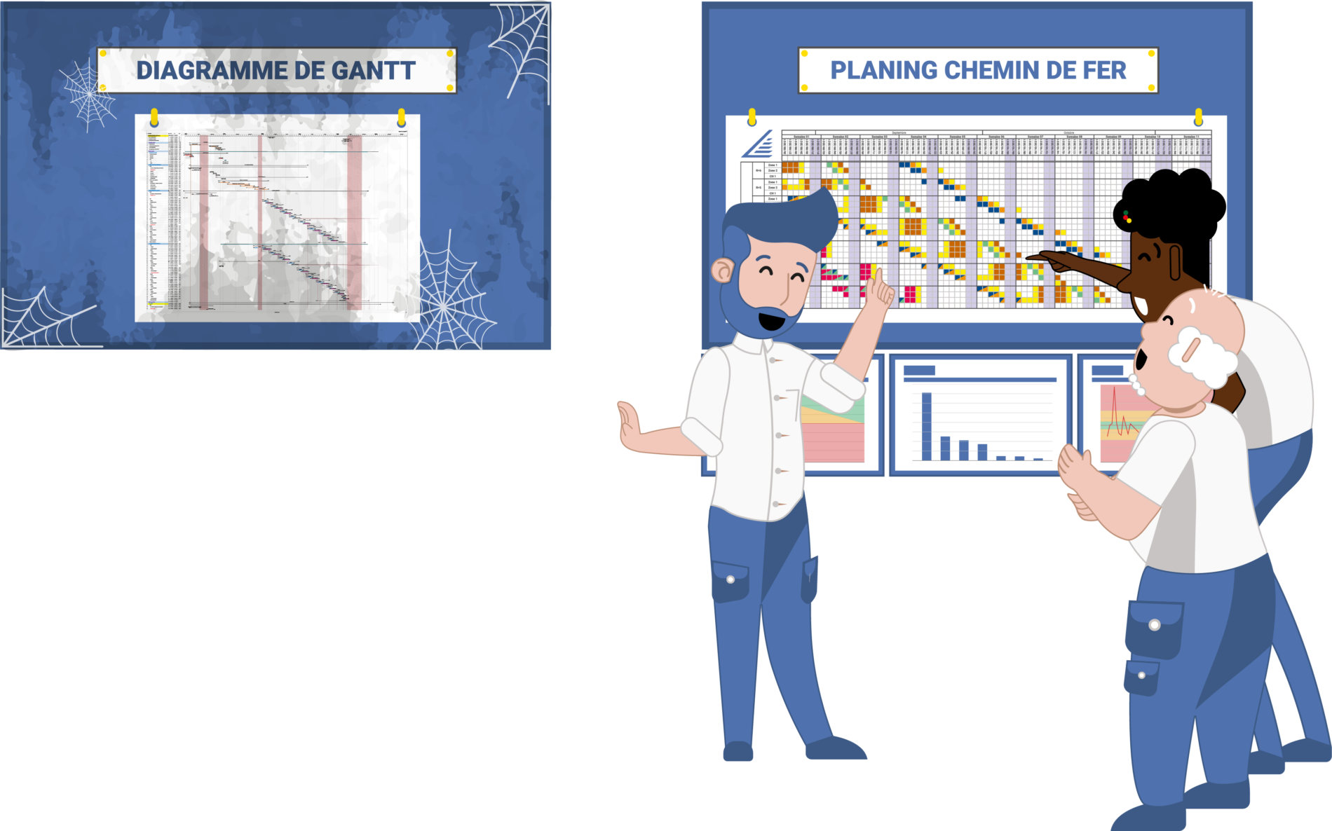 L’outil central est le planning chemin de fer. Il rend visibles les flux et le rythme du chantier. D’autres outils Lean complètent l’analyse, comme le VANVA ou le repérage des 8 gaspillages. Ces approches permettent de basculer d’un pilotage macroscopique vers une gestion opérationnelle des délais.